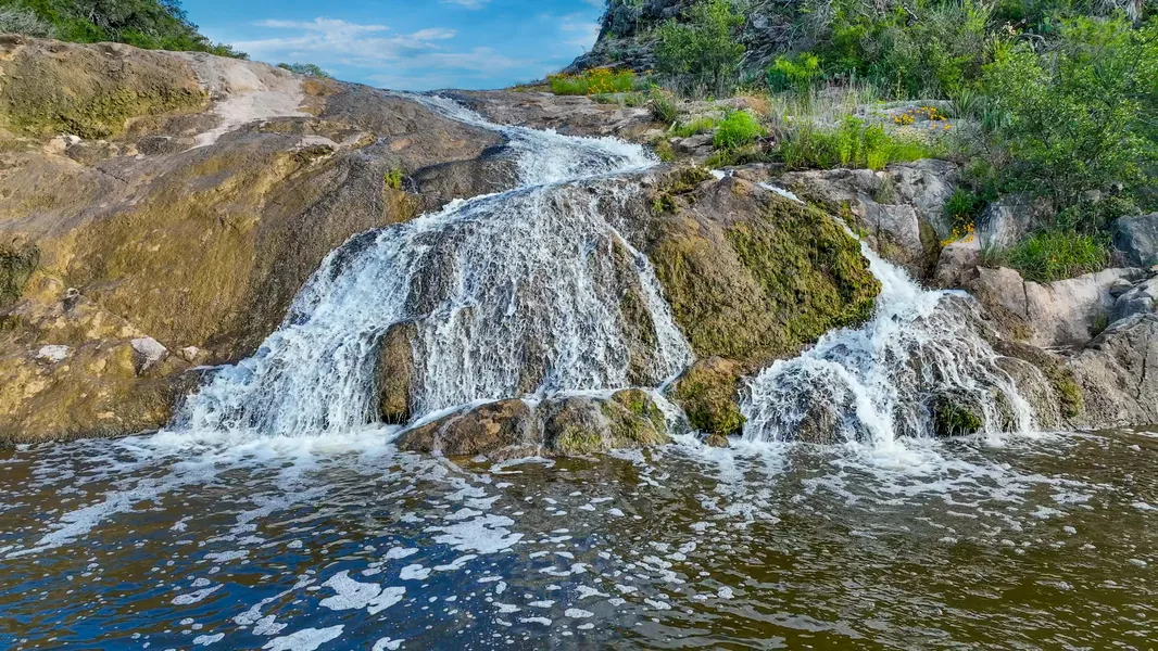 The Mill Pond Ranch features the most incredible water we've seen on a ranch in Texas bar none. The unequaled highlight is a waterfall flowing into a natural hole that encompasses several acres and is apparently over 60 feet deep (dubbed the Mill Pond), which looks like it should be a state park. Theres well over a mile and a half of both sides of Hamilton Creek which has rapids, pools and is limestone rock bottom with large bluffs along some stretches in addition to 4 large concrete dams. The dams themselves are incredible, some of them over 200 feet wide and as much as 14 feet tall, they back up acres and acres worth of spring fed water.