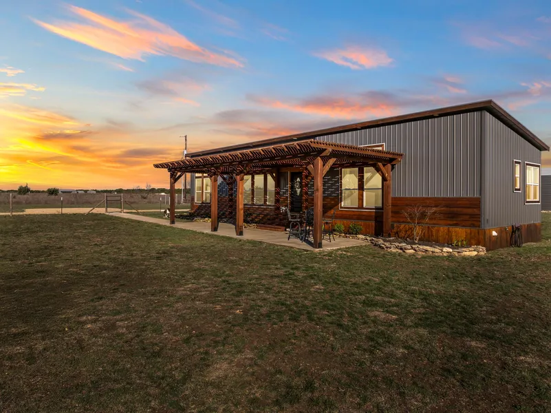Welcome to your dream Barndominium, a serene retreat in the heart of the Texas Hill Country on just over 5 acres of breathtaking land. This charming 2-bedroom, 2-bathroom home spans 1,188 square feet and offers the perfect balance of rustic elegance and comfort. The open-concept kitchen (all appliances convey), dining, and living area provides an ideal space for entertaining, while the primary suite features a soaking tub, separate tile shower, and dual vanities for modern comfort. Designed for efficiency and durability, the home is well-insulated with dual-pane windows on both the home and garage and is kept comfortable year-round with a 3-ton A/C unit. Recent upgrades include a stylish backsplash and shower, as well as a detached garage. The driveway and garage were chipped and sealed in February, ensuring a dust-free entrance and exit. Surrounded by nature, this 5+ acre property boasts seven trees with landscape lighting, including a variety of Oaks, Cherry, Dogwood, and Magnolia, creating a picturesque landscape. A stunning 40 x 17 cedar pergola welcomes you at the front entrance, while the covered 12 x 24 back deck with outdoor lighting offers the perfect spot to unwind and take in the peaceful surroundings. For added convenience, a 20 x 30 RV cover is situated behind the detached garage. The property is AG-exempt, attracting abundant wildlife, such as birds, grazing cows, and a breathtaking Bluebonnet field in the spring. A half-acre fenced yard makes this home ideal for pet owners, offering plenty of space for furry family members to roam. Despite its private setting, this property is minutes from the charming town of Lampasas, where you can shop and grab a great burger! You are also a short drive to Austin, Fort Cavazos. Dont miss this rare opportunity to own a slice of Texas paradise! Riding lawnmower, washer, and dryer to convey! Living room furniture is negotiable. **1% lender incentive with Seller's preferred lender**