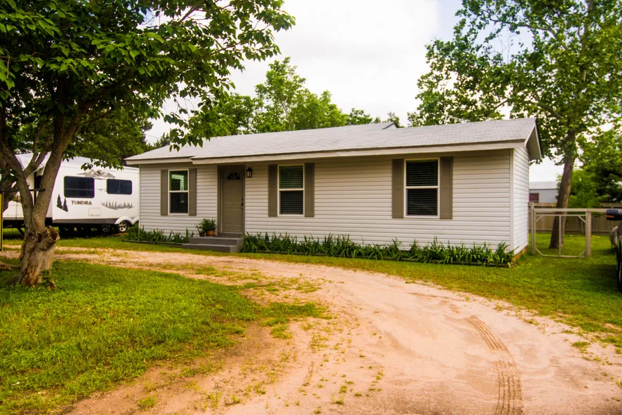 Come see this quaint remodeled home nestled on three full lots with plenty of big shade trees. This property is an absolute must see. A 2 bedroom 1 bath, 720 sq. ft home provides modern comfort with its large open living area, up to date kitchen and bathroom. Has its own peaceful hideaway backyard with both a Man Cave which is 26X30 with an 10X30 enclosed area and a she cave. The Man Cave has a window unit for heat and air. The She Cave is 10X16 and also has a window unit for heating and cooling. The back deck is 12X20 great for coffee drinking in the privacy of your beautiful back yard. There is also a big space for your jet skies or boat in an area of 26X45 with a private fence for security. Another wonderful thing that this property has is full hook ups for an RV. Elec and sewer. The lovely peaceful hideaway has access for Lake LBJ. With a small POA of $30.00 a year you can have access to the private paved boat ramp to Lake LBJ. Security is throughout the neighborhood as well. Come take a look at this Beautiful Peaceful Getaway today!!