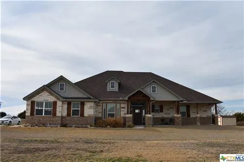 Custom built in 2018 by Tom Lancaster with an abundance of custom features. Including ceramic wood plank floors, granite countertops throughout, wood coffered ceiling in living room, wood beams in master bedroom, wood wainscott in the dining/office, custom cabinets in kitchen, bathrooms and laundry room. Open concept living. Kitchen has center island with sink, built-in microwave, and breakfast nook. Wall to wall carpeting in all bedrooms. Master bedroom is spacious with ensuite bathroom with jetted garden tub and huge walk in shower. The 4th bedroom would make a great mother in law bedroom with its own full bath with tub/shower. Other 2 bedrooms share the 3rd bathroom that also has a tub/shower combo. Yard has Bermuda grass with inground sprinkler system. Water for house and irrigation is provided by its own well. Home is located just south of Lampasas in Burnet county but is in Lampasas School district but outside of city limits, so no city property taxes.