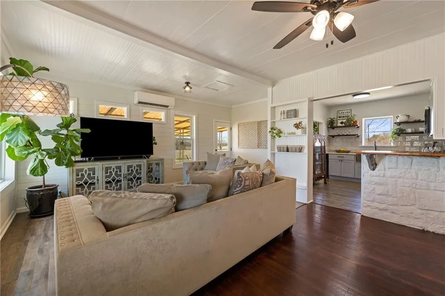 Charmingly renovated farmhouse nestled on 4.96 acres on a corner lot in scenic Bertram, TX! This home features the perfect mix of old school charm with all of the modern updates you could want. The entry of the home features a recently constructed wrap-around covered deck that is not only welcoming but also provides a peaceful setting to enjoy the space that the land provides. Inside the home you will find an inviting family room that has that great farmhouse feel, featuring a mix of the old wood floors along with modern vinyl flooring as well. There is a dining area off of the family room, as well as exterior access to the covered parking. The kitchen has been fully renovated with modern cabinets, stainless steel appliances and a farmhouse sink. There is a laundry/pantry room as well for convenience. The bathroom has also received a facelift complete with a fresh tile, a free-standing vanity and subway tile in the shower. Next to the bathroom is a nice sized secondary bedroom and a large hall closet. The primary bedroom is at the end of the hallway and has its own climate control unit as well as a door leading out to the wrap-around porch. The cozy 3rd bedroom currently does not have a door, but has been framed for a door to be hung. The outside of the property is peaceful with plenty of space to roam. There is a well house behind the home that houses the pressure tank and an Aquasana whole house well filtration system with UV treatment. Another shed/barn provides additional storage as well. The property is conveniently located at the corner of County Road 322 and 1174, providing easy access to HWY 29. Here is your chance to enjoy country life with convenience in a move-in ready charmer that you won't want to miss! FEMA Unknown.
