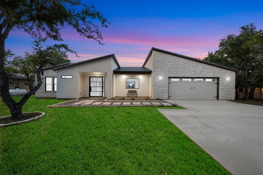 Elegant waterfront sanctuary awaits you nestled high on a peaceful enclave. Offering breathtaking views of Texas Hill County and the Pedernales River. Enjoy gatherings in the generously sized living/dining area under exposed fir beamed ceilings graced by a sleek floor to ceiling fireplace. Beautiful wide plank hardwood floors and wonderful natural night flow throughout the home's open, airy layout. The top-of-the-line chef's kitchen is clad with premium finishes and fixtures including quartz countertops, Thor gas range with double ovens, Samsung Refrigerator, and wine fridge. Wall of glass sliding doors showcase views while opening the home to even more light and air. Spill out to the awe-inspiring covered outdoor living and extended deck which can be accessed from four rooms. White limestone and stucco exterior with a metal roof showcase clean modern lines and great curb appeal. At 3223...