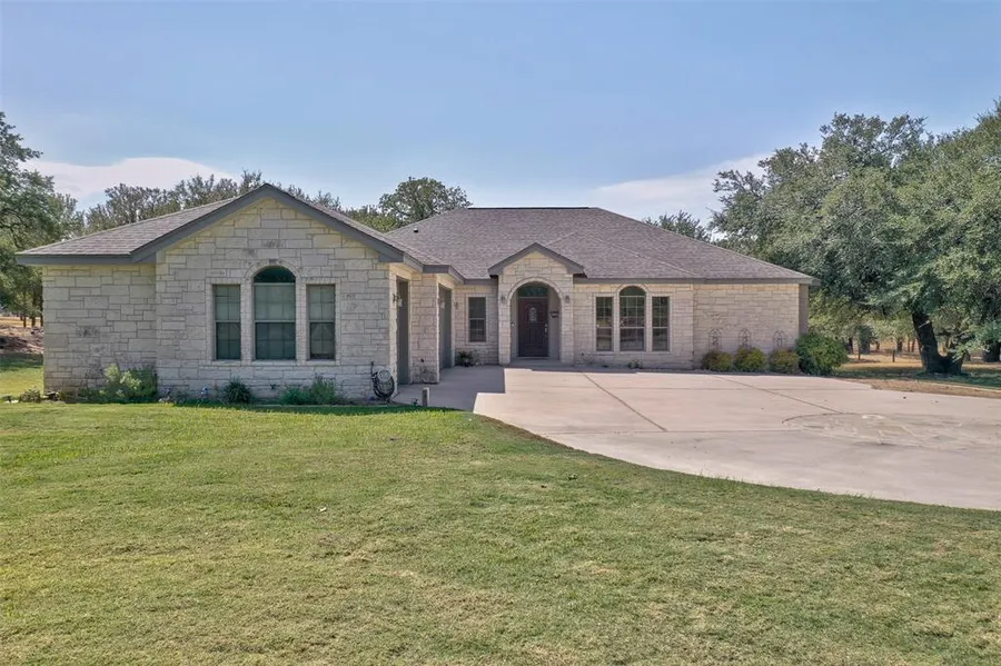 What a hidden jewel for those wanting a nice, well cared for gated community of large acreage lots off the beaten path for privacy but surrounded by friendly neighbors and a short walk to the lake with access from a small park for swimming, fishing, or launching a kayak. The white stone single story home has a 3 car swing in garage and driveway that offers a lot of off-street parking. The front yard has been improved with adding a pipe for drainage across the front and filling in the culvert so you have a nice sprinklered, landscaped front yard with no muddy, weed filled culvert to maintain. Step inside to an open concept foyer with the study to your right that overlooks the front yard, and then into the large family room that is open to the kitchen and dining. But, BEST of all is the new addition of 16' panoramic bi-fold glass doors that fold back to allow family room to flow right onto the covered patio making one very large open air space to enjoy for much of the year. The rooms at the back of the house, including the primary bedroom, family room, kitchen, and dining, all have great views of the tree covered pasture land behind it. This lot has been expanded to just under 2 acres, which can be seen on the attached surveys. The primary bedroom has a separate door to the patio, an attached bath with double vanity and extra storage, a jetted tub, separate shower and large walk-in closet. Two additional bedrooms share a bath on the other side of the house for even more privacy. The oversized utility room is located off the hall near the garage for an easy drop off zone and there is an additional guest bath there also. So for lower taxes, a little peace and quiet, cheaper water from your own well, and a new HVAC system check this one out soon.