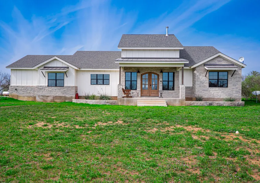 This gorgeous, custom-built home in the Granite Hills subdivision in Burnet is a stunning 3 bed, 2.5 bath property with over 2552 square feet of living space. Situated on a spacious 5-acre lot, this home offers plenty of privacy and room to spread out. As you enter the home, you will notice the attention to detail and high-end finishes throughout. The kitchen is truly a chef's dream with a 6 burner propane convection oven, built-in microwave drawer, and a large island with quartz countertop and electricity. The kitchen also features quartz backsplash, pot filler, and ample storage space. The open concept living area boasts 14-foot ceilings and wood beams for added character. An electric fireplace in the third bedroom adds warmth and charm to this already inviting space. One unique feature of this home is the mud room inside the garage door - perfect for storing shoes or other items when coming inside from outside activities. The laundry room also has its own sink for added convenience. The master bedroom is not only spacious but also includes soundproofing in its walls for additional peace and quiet. The en-suite bathroom features a large wet-room with shower and soaking tub that is wheelchair accessible. Outside, there is plenty of space to entertain or relax on the covered patio which includes an outdoor kitchen complete with grill & sink w/granite countertops. There's even electricity & propane setup for future use such as adding a pool or hot tub. In addition to the attached garage that can accommodate two F250 trucks, there's also a separate metal building on-site that measures 30 x 40 feet! This building has its own septic system set up for water/electricity & an awning specifically designed for RVs - including a convenient 50 amp plug! Other notable features include water softener system, tankless hot water heater, backup generator with plug and propane fuel supply, and a setup for electricity & propane for future use.