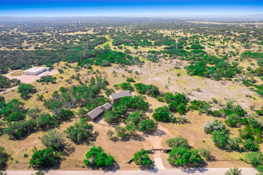 Welcome to the prestigious gated community of The Overlook, where luxury and tranquility converge in this one-of-a-kind property. Spanning an impressive 16.37 acres, this exquisite Hill Country retreat offers 4 bedrooms, 3.5 baths, and a generous 4,301 square feet of living space. The main home welcomes you with 3 spacious bedrooms and 2.5 well-appointed baths, ensuring ample space for comfort and relaxation. The heart of the home is the downstairs living area, featuring a kitchen that boasts granite counters and custom cabinets, ideal for any gourmet chef. Gather for meals in the dining room or unwind by the fireplace in the expansive living room. For those who love to entertain or pursue athletic endeavors, this home offers an enormous game room PLUS an indoor basketball court. Imagine hosting family gatherings and friendly competitions in your own private indoor arena! But that's not all the property also includes a second building that is a car enthusiast's dream. This expansive structure features a 5+ car garage complete with a workbench and sink for all your projects. Above the garage, an efficiency living area provides the perfect space for guests or additional living quarters. Don't miss your chance to own this incredible Hill Country property in The Overlook. With unmatched amenities and abundant space, this home truly offers endless possibilities.