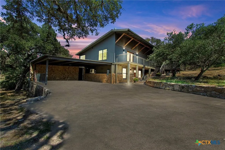 Welcome to the fully renovated 103 Breezeway Drive, a nature-inspired oasis on more than 1.25 acres just steps from Lake Buchanan! This home was taken down to the studs and rehabbed with new plumbing, HVAC, electrical, flooring and all finishes as part of a TV show airing this fall on A&E! The first floor features two generously sized bedroom suites adjoined by a cozy living area. The first primary bath blends warm wood and earth tones with modern fixtures, including a large vanity and step-in shower. French doors in that suite open to a secluded outdoor terrace with custom reclaimed stone firepit and freshly sodded lawn. The second bedroom suite has an oversize walk-in closet and full bath with double vanity. Upstairs, the vaulted ceilings with exposed beams and abundant windows lend an airy feel to the main common area. A functioning vintage heating stove on a raised hearth is the corn...