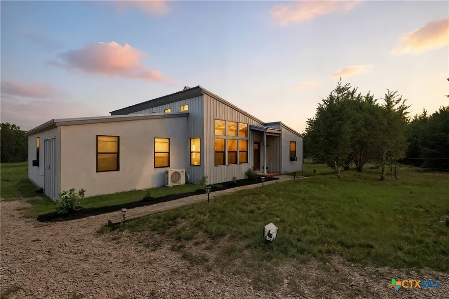 AFFORDABLE Country Living has Arrived! This barndo style home built in 2022 features three bedrooms, two bathrooms, great room style living/dining with a split plan. Kitchen is open to the entire great room area with island dining adorned with pendant lighting as a visual separation. Soaring beamed ceilings give the feeling of sprawling space in this 1684 sq ft main home. Dual head mini-split for the primary suite and main area, small window units for each of the additional bedrooms. Covered front porch greets you and the covered back porch is great for sunset views. Additionally, an attached storage room could easily be made into additional living space or is excellent storage as is. Detached two-car metal garage with an approximately 400 sq ft HVAC space with full bathroom gives you ample options. This space is the perfect home office, hobby space, studio, or potential ADU. Fenced and cross-fenced with a loafing shed; bring your horse! Ag use letter with low taxes. Minimal restrictions in this gated community. If you have been looking for your own little piece of Texas country at an affordable price, welcome to 495 Hurst Place Blvd! This value cannot be beat!! PRICED TO SELL