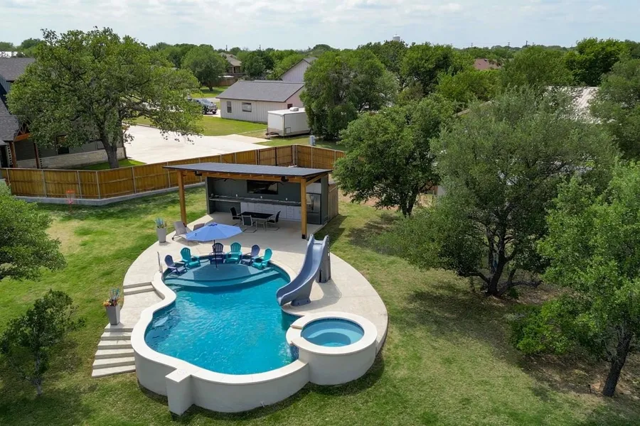 This 4-bedroom, 3-bathroom, 3-car garage, 3,780 sq. ft. custom home offers privacy with miles of panoramic views, surrounded by Double O Ranch, yet just minutes from Hwy 281 & 1431. Enjoy beautiful sunrises and expansive natural light from the open floorplan, with 10' flat ceilings and a split bedroom layout. The living and dining rooms face East & North, overlooking the treetops. The resort-style backyard features a large East-facing pool cabana with a full-size fridge, TV, and surround sound, perfect for entertaining. Relax on the back porch with ceiling fans, heaters, and a TV. The backyard is fully fenced for privacy and safety. Energy-efficient features include a 3-zone HVAC, spray foam insulation, LED lighting, DC ceiling fans, tankless propane water heater, gas stove, double-pane low-E windows, and insulated garage doors. All 4 bedrooms and 3 bathrooms are on the main level, with a spacious laundry room near the master closet. Upstairs is a 745 sq. ft. multi-purpose room. The long concrete driveway is ideal for extra parking or recreational activities. No HOA/POA means more freedom for you! Come see it for yourself – this won’t last long!