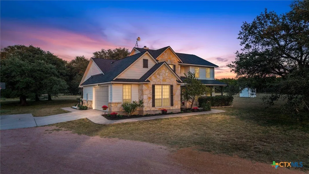 Experience peaceful Texas living on 10 private acres surrounded by scenic views and majestic oak trees. A gated entrance with an automatic opener welcomes you into this beautiful property featuring a 4-bedroom home with an office, 2.5 bathrooms, and an attached 2-car garage. Inside, soaring ceilings with floor to ceiling living room windows and a rock fireplace create a warm, inviting living space. The kitchen offers abundant storage including a custom spice drawer, new appliances within the last 3 years-stove, convection microwave, oven, and dishwasher-and a large under-stair pantry. The spacious primary suite on the main level features a walk-in shower with bench seating and a bright, oversized closet. Enjoy thoughtful updates completed in August 2025: upgraded LVP flooring with transferable warranty, interior and exterior paint on all buildings, new fixtures and toilets in all baths, and a 50-year roof. The home also includes new well pump (2022), hot water heater (2025), ceiling fans, and wiring on eaves for lighting or holiday decor. Outdoors, relax on the wide front and back porches while taking in peaceful Texas sunsets with views of turkey and deer. The fenced property offers a 3-car carport with workshop space, RV hookups with 50-amp service, dog kennel, kids' play area, and a remote-entry gate with lock feature. The underground hog-wire fencing, extra-thick foundation, and flood lighting add both security and function.