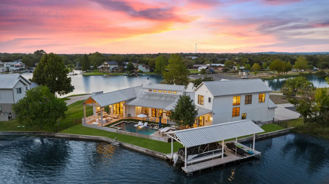 Nestled on a serene 0.60-acre peninsula on Lake LBJ, 703 Woodland Hills is a breathtaking waterfront estate, boasting an extraordinary 332’ of open waterfront enveloping both sides of the property. This meticulously reimagined 3,700 sq ft, 4-bedroom, 4.5-bath modern sanctuary exudes upscale elegance with soaring wood and beamed ceilings, expansive windows, and abundant natural light, framing mesmerizing Lake LBJ views from every angle. The gourmet kitchen, adorned with top-tier finishes, appliances, and a spacious island, flows seamlessly into an open-concept living area, perfect for grand gatherings. A versatile bunkroom and upstairs living space offer flexibility, while the converted garage serves as a dedicated fitness haven. Step outside to an unparalleled outdoor oasis, featuring a sparkling pool, rejuvenating spa, state-of-the-art outdoor kitchen, and a cozy cabana with a fireplace, all set against the lake’s tranquil beauty. Lake LBJ is a Texas Hill Country jewel, inviting endless adventure with its constant-level waters, ideal for boating, fishing, kayaking, paddleboarding, and waterskiing. The property’s boathouse and jet ski lifts elevate your waterfront lifestyle, catering to both thrill-seekers and those craving serenity. Just minutes from the many world-class dining, luxurious spas, and championship golf courses in the area, this home blends sophistication with leisure. Perfect for family retreats or the luxury of full-time living on the lake. Life is Short // Buy the Lake House!
