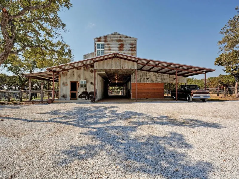 Equestrian Estate approx. 30 minutes from Downtown Austin. Unrestricted, privately gated 10 +/- acres complete with a well appointed Barndominium. 2/2 kitchen, living upstairs, 1/1 kitchenette, living down. Illuminated arena, pole barn, 3 16x16 stalls, tack room, hay barn, storage, RV hook-ups, outdoor shower, internet, satellite dish, high end security cameras, filtered tank/pool. Wonderful opportunity to operate a commercial horse operation. Privacy, views!