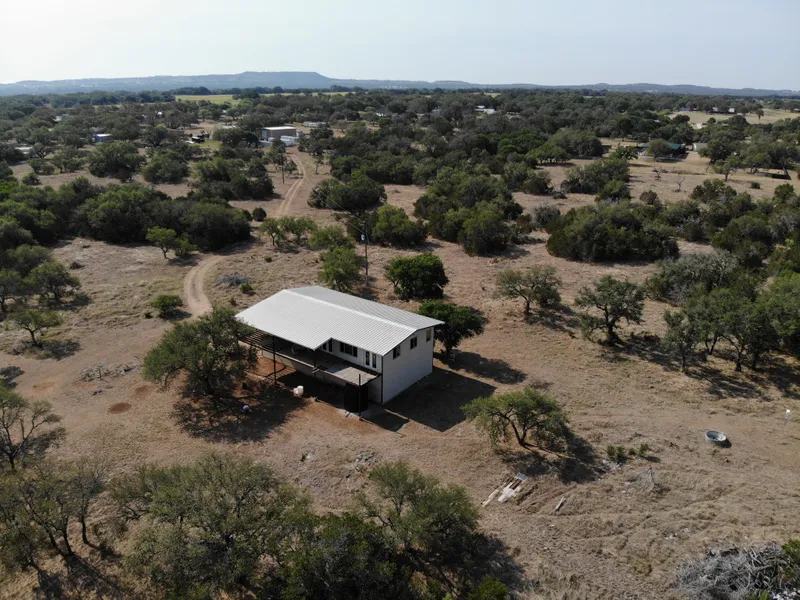 The current improvements include a large 30'x 60' 2 story Barndominium. The bottom floor is a combination workshop/garage with the second story being 1800 sq. ft. of living space. The combination living room/kitchen and Master Bedroom is ready for insulation and sheetrock. The laundry room has been completed and is being used as a bedroom/apartment. Septic was installed about 4 years ago and is in great working condition. The living room/kitchen opens onto a large deck running the full length of the house (11'x60'), with the Hill Country view and nice breeze it is easy to imagine the possibilities. Although not complete the Barndominium is ready for someone to come in and put their own finishing touches on it. Water for the property is currently provided by a storage tank. The Barndominium was constructed with the intention of installing a Rainwater Harvesting system. Neighboring well logs show very strong ground water so drilling a well is also a great option.