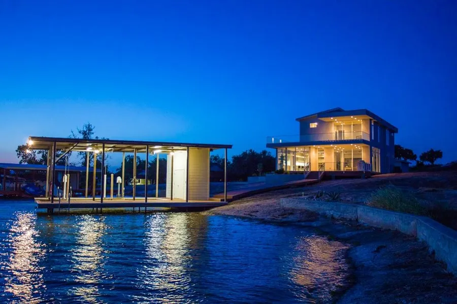 Custom built modern masterpiece with 110 ft of excellent Lake LBJ waterfront. This 4 bedroom, 3.5 house was designed by Bishop Architects out of Austin, Texas and built by locally known home builder Terry Dauphine. Floor to ceilling windows and very open floor plan provides for tons of natural light and brings Lake LBJ into the living room. The perfect lake layout with 4 large bedrooms, main level master and two living rooms. Wrap around balcony on second level offers sweeping views of Lake LBJ and the Texas Hill Country + Double Water view! Detached two-car garage with glass garage door and plenty of room to add a guest house. This property has never been lived in and is as new as the come. New construction on Lake LBJ is hard to come by and this is one that is definitely worth checking out.