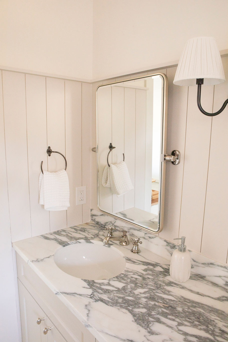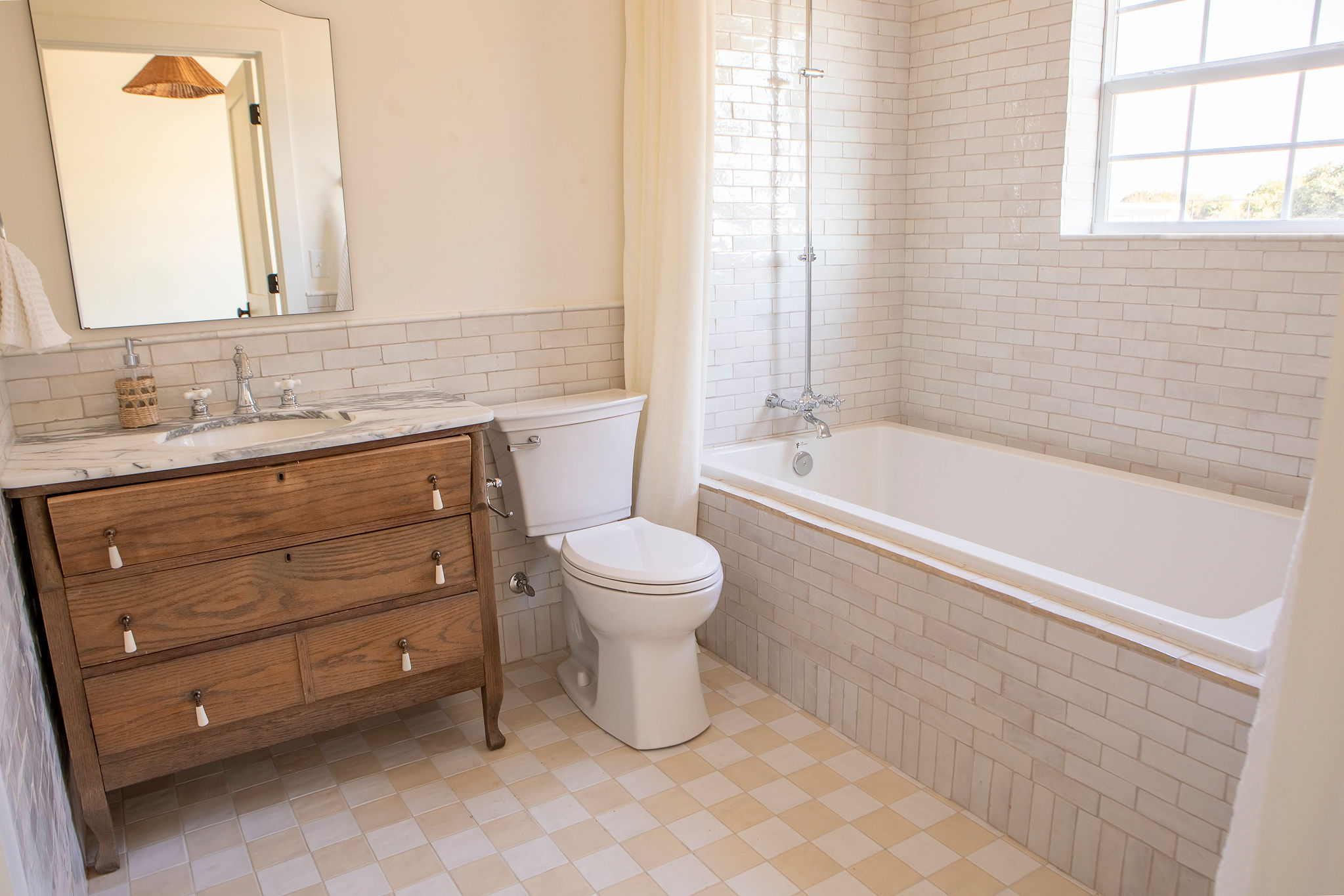 The Bathrooms: Thoughtfully designed sanctuaries with refined finishes. The primary suite includes a walk-in marble-tiled shower and dual marble-top vanity. The guest bath features a unique wood vanity, stylish tub-shower combination, and designer tilework.