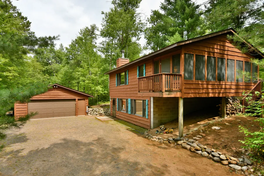 Nestled in the towering pines and oaks is a remarkable cedar four season 3 bd, 2 ba cabin (built by Anderson Construction) as well as a 28 x 24 detached garage. Stroll over to your sandy shared shoreline; boat, fish & swim on Tabor Lake enjoying the clear waters. Cabin boasts a spacious screen porch that sits right off your flowing kitchen, eat-in breakfast bar, dining and living areas. Special nooks for reading, enjoying the gas fireplace or just joining the others for fun. Walk-out lower level features a bright family room, another sleeping area and a bathroom. Detached garage has room for entertainment, games and storage of your toys. Next to the lake, right off the trails and close to recreational activities!