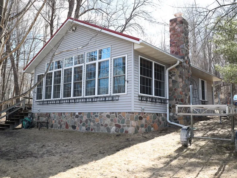 Vintage appeal with modern sensibility - this cabin packs a punch! Spacious great room with wood floors, vaulted ceiling and stone wood burning fireplace. Large windows fill the cabin with light and fantastic views. Quality kitchen cabinets as well as built in storage cabinets. Maintenance free exterior with stone accents. Level lot on a great fishing and recreational lake.