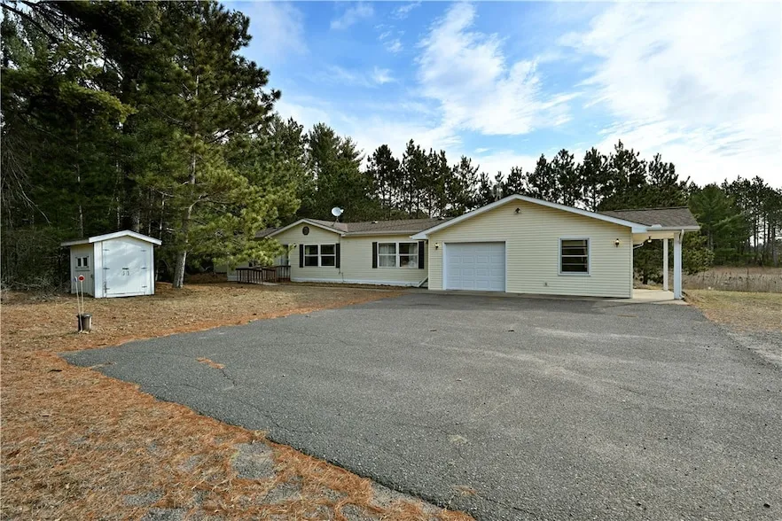 Nestled in the heart of Grantsburg, WI, the vibrant Hay Creek residence is a delightful one-level sanctuary wrapped in modern convenience. Imagine entering a sun-drenched living space where vaulted ceilings stretch above, creating an air of openness and adventure. The spacious kitchen, extensive cabinetry, complete with a breakfast bar center the home within its 3 bd, 2 ba & laundry area floor plan. This home is all attached to a versatile family room or studio that is bathed in natural light for a picturesque sunroom/screen house effect that offers a front-row seat to admire the whims of Wisconsin weather. When practicality meets luxury, you have an attached 22x15 heated and insulated garage, ideal for avoiding winter s icy grip. Plus, a 6x6 storage shed stands ready to house your DIY aspirations. Hay Creek isn't just a home; it's a playful canvas for living.