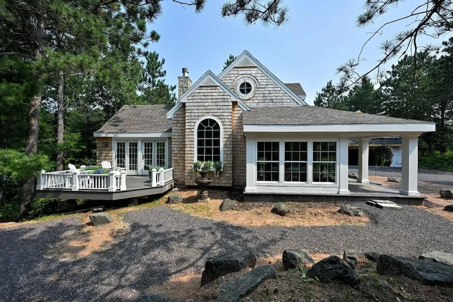 Tucked away on a private, gently winding driveway that promises serenity & privacy, this one-of-a-kind, meticulous maintained, Charming French Cottage sits on a breathtaking 5-acre wooded setting that comes Turnkey & Move-in ready with custom designed furniture making it ideal as a primary residence or a potential Airbnb. No need to try and duplicate this beauty as everything stays with the property. REMAINING NEW CONSTRUCTION: Detached oversized 2 car garage, with guest suite and private entrance (2BD, 1 BA, kitchen, great room and windows throughout). This custom-owner-built home invites you into a world where no detail is missed & is crafted with love & care. From the welcoming front porch with stonework, pavers, quaint window boxes, cedar shakes & shiplap ceilings, to the handcrafted interior finishes every inch that exudes timeless elegance. Experience the charm of this gem offering New Port English oak wide plank flooring, Turkish stone, Quarter-Sawn oak crown molding, owner's signature coffered ceilings, built-in benches, soft-close cabinetry, ceiling beams, detailed fireplace mantels & corbels showcase the owner's attention to detail & unique character. The gourmet kitchen is a culinary artist s dream with high-end commercial grade SS appliances & granite, a gas stove, Italian porcelain farm sink, Turkish tile, tile inlay, custom built cabinets with roll out drawers, soft close cabinets, a Lazy Susan & built-in cabinets. The home s comfort is only matched by its beauty, with a great room & sunroom sharing a majestic two-sided wood-burning stone fireplace. The 4-season porch offers radiant heat & shiplap accents for year-round enjoyment. Upper level boasts an owner's suite, complete with three thoughtfully designed closets, including a walk-in, off-season, & linen. Unwind in the en-suite owner's bath featuring custom built-in cabinetry, Turkish stone & a large soaking tub, offering an oasis of peace and tranquility. Additional highlights include: a den (with option for 2nd bd) with the owner's signature Coffered ceilings, built-in cabinetry & upgraded lighting, main floor laundry, a built-in wine cellar & vast storage area. The walls of windows (Pella) & patio doors (Andersen) that frame the natural surroundings. Enjoy the maintenance-free deck, scenic trails & abundant wildlife in this serene, storybook setting.