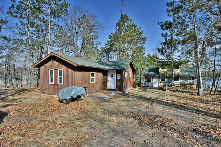 Nestled on the serene shores of Deer Lake, this unique waterfront property invites you to embrace the tranquil beauty of nature. The highlight is a charming one-bedroom rustic log cabin, exuding warmth with exposed beams, rough-hewn textures, and a cozy stone fireplace. The cabin's corner breakfast station and bright front porch are perfect for enjoying peaceful mornings. Additionally, a spacious lakeside metal bunkhouse (30 x 26) awaits your creative touch, offering endless potential. Expansive at 3.6 acres, the property boasts a remarkable 148-foot sandy beach shoreline, ideal for swimming. A functional boathouse provides ample storage and possibilities for further customization. This extraordinary retreat promises the opportunity to craft your dream lakeside haven. Embrace the tranquility, charm, and potential of this Deer Lake treasure. (Use the Outhouse/Privy as No Bathroom; however conventional septic & Sandpoint well are installed)