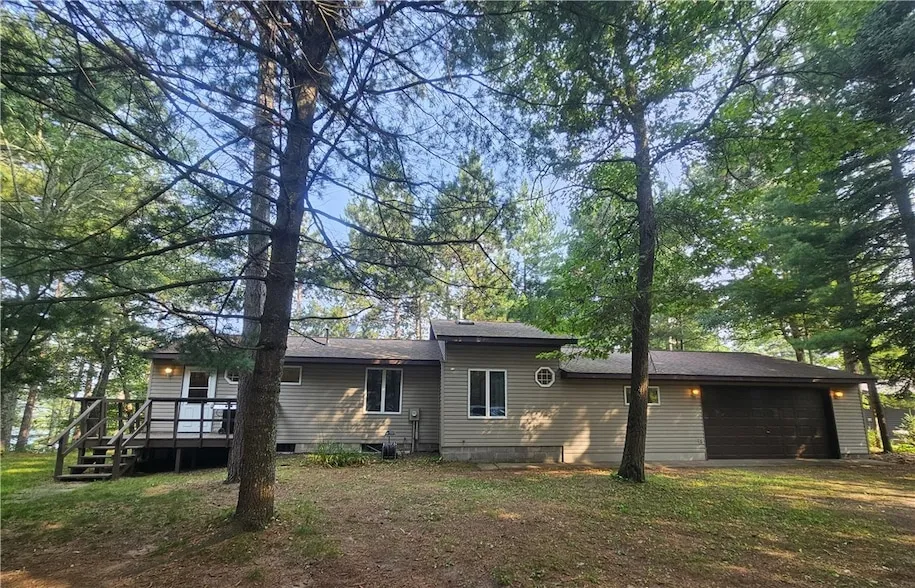 This enchanting retreat boasts 120 feet of sugar sand beach, 2.7 acres of land on Johnson Lake all invites you to embrace the serene, crystal clear waterscape and pine peppered land. The lakeside sun porch. wrap-around decking and multiple living areas provide breathtaking views of the Northwoods ambiance. Experience the flow of open spaces illuminated by massive windows & doors. Three cozy bedrooms with a bright bathroom, promises comfort and relation. The master bedroom, crowned with a skylight, offers a starlit escape. A walk-out basement, equipped with a kitchenette, sleeping area and workshop enhances convenience. Lots of storage in your attached garage, detached garage, lakeside boathouse. Ready for adventure? Enjoy a paddle boat, pontoon, a swim to the swim raft or an evening by the fire pit. This enchanting, turn-key cabin awaits!