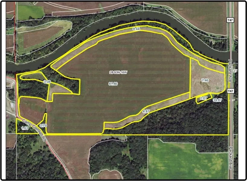 162 acres, m/l, located 5 miles NW of Clarksville on the west side of Co. Rd. T47. Farm has 106.38 FSA crop acres and a CSR2 of 86.1. Combination of crop and timber with excellent hunting. Super PLC yield of 177 indicates the potential of this productive ground. Excellent timber ridge in the SE corner of property would lend itself well for a building site or many recreational uses.