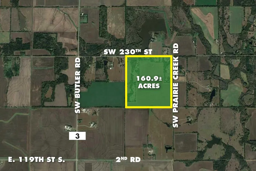 NO MINIMUM, NO RESERVE!!! 160.9 +/- acres of recreational and agricultural land in Butler County near Douglass! This property is zoned AG-40 Agricultural District and sits at the corner of SW 230th Street and SW Prairie Creek Road. Approximately 95 acres are crop land with about 65 acres of recreational land and pasture. There are two ponds on the property that would make for some great fishing fun! There is currently a 1/3 owner, 2/3 farmer lease share crop agreement.