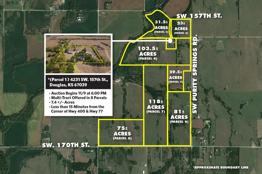 A Multi-Tract Auction allows multiple tracts of real estate to be sold collectively or in any desired combination. This method of auction will offer multiple rounds of bidding allowing for bids on individual tracts, any combination of tracts, and all tracts together. The auction will begin with each tract being offered individually, followed by multiple rounds where bidders can make combinations and increase their previous bids to stay in the winning position. Bidding rounds will conclude when bidders no longer want to create new combinations or raise previous bid amounts. A digital board will be displayed to guide you through the auction process and have a clear understanding of current bid amounts. See "Downloads" section for explanatory PDF.
