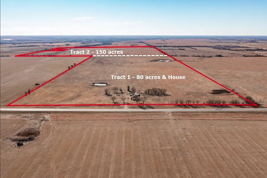 TRACT 1: Great location blacktop frontage! Fix up the 2 bedroom, 1.5 bath stone house or build your dream home. Rural water, electricity, and septic sewer are already in place; along with a nice 3 car garage/shop. 80 acres of good Flinthills grass with 3 nice ponds for watering livestock and good perimeter fence on 3 sides- south side is unfenced and currently grazed with the south 150 acres (Tract 2).