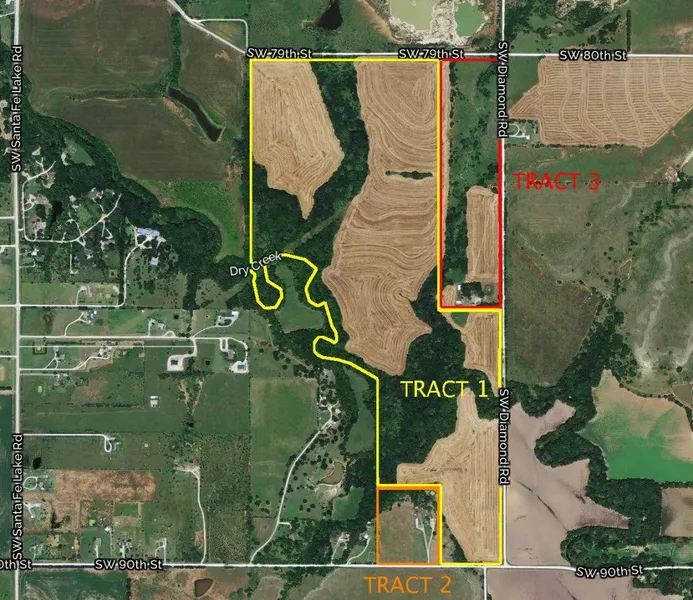 PROPERTY DESCRIPTION: 185+- acres of tillable ground along Dry Creek and timber. This property offers excellent agriculture income and recreation. Abundant wildlife consists of Kansas Whitetail Deer, Turkeys, and Quail. Dry Creek provides water to Santa Fe Lake, so the fishing is excellent.