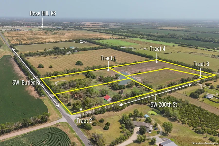 LIVESTREAMONLINE ONLY!!!20+/- acres offered in 4 tracts,are located near the intersection of SW 200th St and SW Butler Rd, just south of Rose Hill, and offerprime home sites! Enjoy country living with the amenities of Rose Hill and Derby nearby!