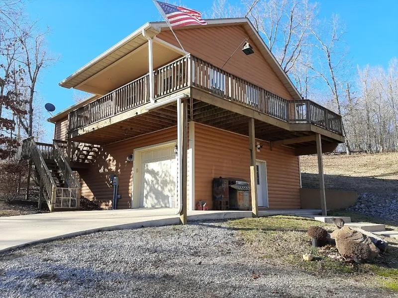 Rare find: Custom built cabin with Private Lake access. 3 bedroom, 2 1/2 baths. Home features open floor plan with beautiful stone fireplace & Brazilian Cherry hardwood floors. Over 1000 sq.ft. detached garage heated and cooled. This home has tons of storage with all appliances included, even a hot tub off master bedroom. Perfect for a family or a family with a lot of cars. 2 bedrooms in basement have no windows. Call for a showing.