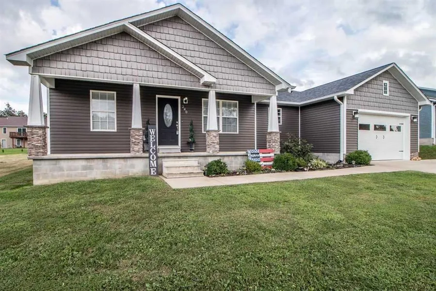 240 Murfield, Poplar Bluff - 3BR 2BA all electric custom home in Murfield Subdivision just SW of Poplar Bluff. Divided bedroom open floor plan with vaulted ceilings and lots of custom detail. Craftsman columns adorned in stone and shake accents above the covered front porch provide excellent curb appeal. Nice master suite with dual vanity, soaking tub and custom tiled shower. Large rear covered deck and fenced in backyard. The kitchen features custom cabinets and countertops with stainless steel appliances. Lots of pretty solid surface flooring and tile. This 'one level' home is situated on a level lot with low maintenance landscaping.