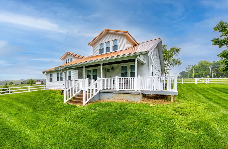 Unique opportunity to own your own mini farm! Updated and beautiful farmhouse with large first floor primary bedroom with deluxe bathroom. The home features a total of 4 bedrooms, updated kitchen, formal dining room, large living room, 3 full bathrooms, 2 laundry rooms, sun room & nice covered front & back porches. The large detached garage also features an office with a half bath. The home is situated on 5 acres with five silos and an enormous Barn/Quonset hut(45ft x 101ft) with concrete floors and electric.
