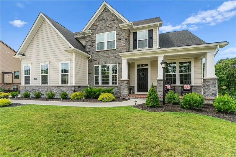 Better than new! This move-in ready, 1-year-old, luxury Heartland home features gracious living space and the extras discerning buyers ask for, like tinted windows, upgraded kitchen cabinets, quartz countertops and a double oven, hardwood floors throughout the first floor, formal dining room 1, upgraded carpeting, a widened driveway, a fully finished walk-out game room with the space for a home theatre or work-out area. On the outside, maintenance-free Hardie-board siding and stone pillars and accents, and a wooded backyard and beyond. The layout features a sunny morning room and a study/office with French doors, great for keeping the records organized or for remote work.