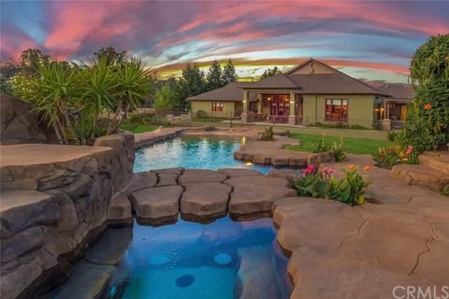 This gated Stilson Canyon Estate will make you feel like you are at your own personal resort! This sensational home is a private oasis on 1.4 acres surrounded by rolling hills and canyon views. The Main Home features four bedrooms and three bathrooms; it's East-wing is an expansive master retreat making this an exquisite split floor-plan. This home is elegant from top to bottom with beamed ceilings, Brazilian cherry wood floors and stacked stone fireplace in the Great-Room. The Kitchen would make any Chef proud, the sheer size will make you want to entertain with double ovens, gas stove top, Butler's pantry and a large peninsula, plus an island. Energy efficient features, solar, encased windows and zoned HVAC systems. There is an a roomy 1,200 sq ft Guest Cottage with it's own 2-car garage; making the total 5 car-garages on the property. This Guest Home is very open and features a full-kitchen, a bedroom and office plus a private patio. The pi ce de la rsistance would certainly be the Resort-style pool with multiple waterfalls, beach entry, hot tub and a rock slide! Make this retreat yours and own one of Chico's finest homes today!