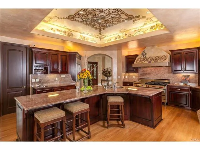 A Custom French Country Home with a Tuscan Style!! Conveniently located in Northwest Chico with only 3 homes on this tree-lined street. The home is privately gated, has solar, and sits on almost 2 acres. The dining room has a cherry wood ceiling and the living room is stunning with 12 crowned ceilings, flowing draperies, and fireplace. Perfect for entertaining with a huge cook s kitchen, granite countertops, 60 Wolfe Range, breakfast nook, old-world textured walls, and cherry wood cabinets. The theatre is a step-up, semi-soundproof room with hand painted walls and ceiling, AV equipment wall, 112 screen with projector, and large windows. The master wing is turned 45 degrees to view the beautiful backyard and features 12 ceilings, crown molding, sitting area, and fireplace. The master bath is done in marble with a steam shower, Jacuzzi tub, faux walls, and special lighting. The office s ch...
