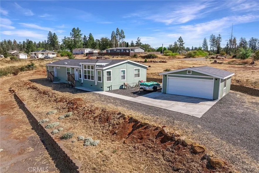 Wonderful Central Paradise location for this 2022 built Manufactured home with 3 bedrooms, 2 baths, 1600 square feet on a full acre with a creek at the bottom of the property. The property also offers a detached two car garage. The home and garage have cement board siding. This spacious home offers the open floor plan concept. The living room offers a vaulted ceiling, upgraded transom windows and recessed lighting. The large kitchen overlooks the dining room and living room. The kitchen offers a 8Ft island with stainless sink, natural gas free standing oven/range, built in microwave, Whirlpool Refrigerator, dishwasher, recessed lighting, pantry cabinets and vinyl plank flooring which runs through the kitchen,dining, hallway and bathrooms. The spacious primary bedroom has a private door to the front yard and vaulted ceilings. The primary bath has a two sink vanity, step in shower with glass doors and lighted mirrors. Both guest bedrooms have vaulted ceilings. The laundry room offers extra cabinets and vinyl plank flooring. Off the front door or back door are concrete walkways leading to the detached two car garage. A wonderful place to call home.