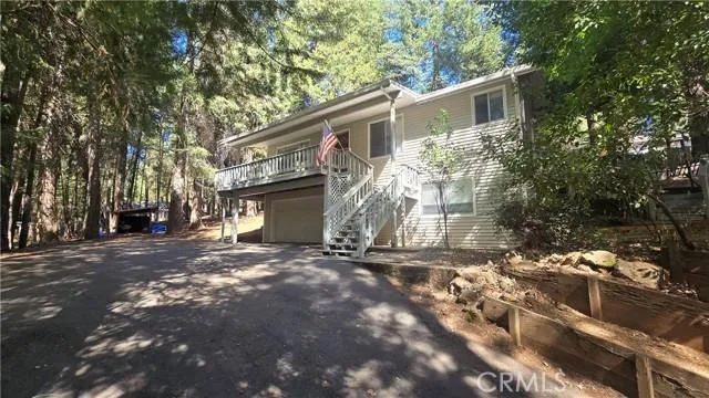 END OF CUL-DE-SAC & CHARMING FOREST RETREAT Your Peaceful Sanctuary Awaits! Welcome home to serenity in the trees! Nestled at the end of a quiet cul-de-sac, this charming stick-built home offers privacy and picturesque forest views from its wrap-around porches. The thoughtful design provides a warm and inviting atmosphere, perfect for unwinding after a long day. The main living areas are perched above the spacious 2-car garage, featuring an open concept layout with a bright living room, a cozy wood stove on a tiled hearth, and abundant natural light. The kitchen delights with tile countertops, a corner sink offering treetop views, and a breakfast bar adjoining the dining area. Both bedrooms offer comfort and practicalitythe master bedroom boasts dual closets and a private en-suite with a walk-in shower, while the guest bedroom opens to the wrap-around porch for seamless indoor-outdoor li...