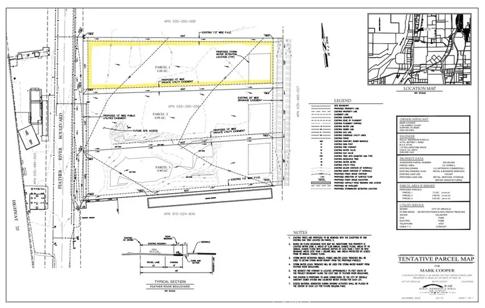 Excellent opportunity Built to suite and owner is willing to carry. Owner WANTS TO SELL 1 ACRE and has a tentative map approved zoned for commercial with Planned Development overlay. It already has CAL Water Meter and the sewer is also available on the same side. Tentative City approval map is for 3 parcels: 1 acre (FOR SALE), .99 Acre (Possible for Sale) and .90 Acre (SOLD). Close to Georgia Pacific and HW 70. Excellent Highway exposure! Close to Walmart. Easy access to highway and services.