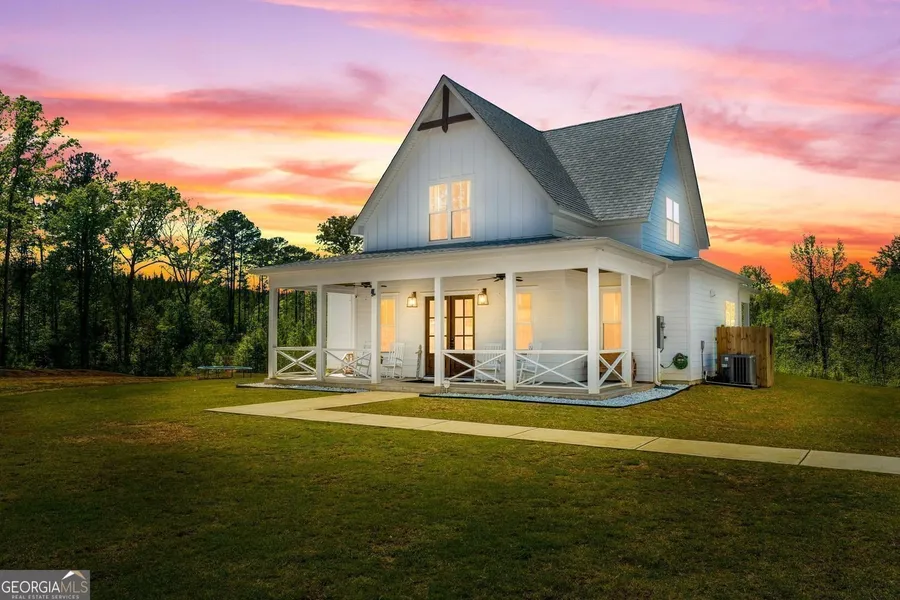 Welcome to the South! Gorgeous Southern Living "Four Gables" Floorplan on over 18 +/- acres with a 40 x 24 detached shop/garage and over 880 +/- square feet of covered porches! Built in 2022, this beautiful home exudes all the southern charm and custom touches, offering over 2,300 +/- square feet, 4 bedrooms, and 3.5 full baths. Enter a farm gated drive and wind down the drive and come home! Enter under a covered rocking chair front porch through a double door entry into a formal foyer to find a well designed living space, perfect for gathering! The kitchen, dining, and family room are all open to one another, with just the right amount of separation. The kitchen features a large island with sink and counter seating for four, beautiful cabinetry with glass uppers, quartz countertops, brushed gold hardware, a custom venthood to match, beautiful herringbone patterned tile backsplash, a walk in pantry, and high end Forno stainless steel appliances, including the oversized Forno refrigerator. The dining area is nice sized and is sun-lit by windows and access to the rear wrap around porch. The family room features an oversized shiplap fireplace as the focal point with rustic wood mantle (fireplace is electric) and also offers access to the rear porch - which offers over 550 +/- square feet of additional outdoor living space. The main level is home to the primary suite, which is a luxurious retreat. The bedroom features plentiful windows and access to the rear covered wrap around porch. The ensuite bath features a marble tiled floor, an oversized fully tiled shower with dual showerheads (one is a rainhead) and frameless glass doors, large dual sink vanity with plentiful storage and shiplap wall behind, a freestanding tub, separate water closet, and a large walk in closet. The main level is also home to the laundry room and a powder room. Upstairs you'll find three bedrooms - two of the bedrooms have tray ceilings and offer their own private ensuite baths with tile floors and custom vanities. The third bedroom is currently used as an office and is serviced by one of the ensuite baths that also has access from the upstairs hall. All bedrooms have walk in closets. There's hard-surface flooring throughout the entire home - either laminate hardwood floor or tile - no carpet here! This home is anything but "cookie cutter." There's custom features throughout - upgraded lighting, tall ceilings and doors, upgraded appliances, gorgeous baths with custom vanities, beautiful kitchen with upgraded cabinetry/appliances/countertops, upgraded flooring, etc! If you love the outdoors - say no more - this home has the porch space to die for with over 850+/- square feet of porches between the covered front porch and the wrap around covered rear porch, both with rustic tongue and groove wood ceilings and ceiling fans. There's a backyard deck/platform overlooking the rear yard - perfect for grilling and to overlook your future pool. For parking, there's a four car covered carport that matches the home. A long gravel drive takes you to the back of the property where you'll find a 40 x 24 detached shop with three bays/garage doors and ample gravel area for parking multiple vehicles/trailers, etc. It's the perfect place for mechanics, wood workers, storage, and/or a home based business to operate. There's plentiful cleared yard space, but the remainder of the acreage is in pretty woods for privacy and nature lovers. The home is constructed of sturdy Hardie Board siding with Board and Batten on the front. Located in quiet Flovilla, a small rural town in Butts County - approx min to Jackson and 20 min to Forsyth. Visit nearby Jackson Lake, High Falls, Indian Springs, and/or Lake Juliette.