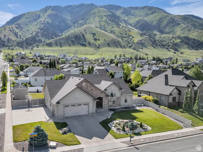 Beautiful home close to the foothills of Green Canyon. Over-sized garage with an extra parking area. Large covered front porch and extra large covered back patio. Large shed in the backyard. French doors to the back patio from the living area and from the primary bedroom. Primary bedroom has a dream en suite with separate bathtub and shower, large double vanity, and walk-in-closet. Vaulted ceilings throughout the main level. Butler's pantry and laundry area in addition to a walk in pantry. The basement is completely finished and has a large and very open great room. The front and backyards are both completely landscaped and easy to maintain. Square footage figures are provided as a courtesy estimate only and were obtained from county records. Buyer is advised to obtain an independent measurement. Agent related to seller. Solar install date is estimated.