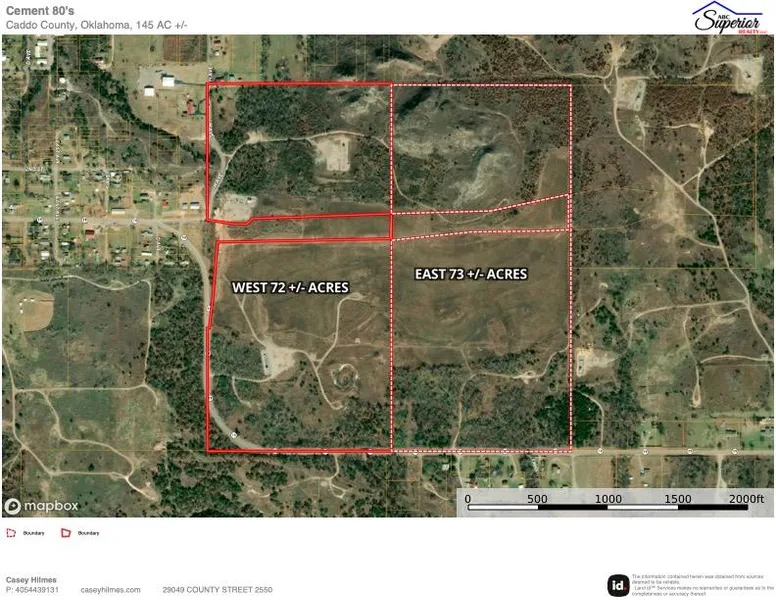 A pair of stand up 80 acre tracts (minus the right of way purchased by ODOT) sit side by side in southeastern Caddo County just East of Cement city limits. The west tract 72 +/- acres offers a useful blend of dryland farm ground, timber and grassland.