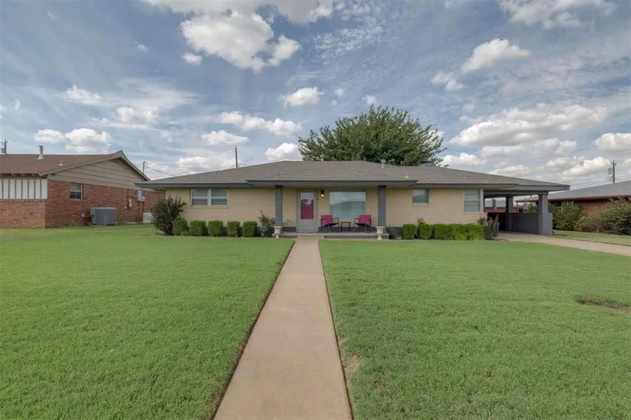 Too many updates to list! This super cute and extremely well done remodel is move-in ready! Roomy main living area, large on-trend open kitchen and dining with butcher block island and oversized custom sliding barn doors to close off or open up den/playroom/bonus area with fireplace. Primary bedroom with en-suite bathroom and large pass thru walk-in closet. Huge second bedroom with double closet. Wood look luxury vinyl plank flooring, carpet in bedrooms only. Fantastic utility room with space for folding table, hanging space, ironing board, storage and access to unfinished partial basement/storm shelter/storage area. Fenced backyard with open patio plus pass-through 2 car carport with alley access; currently set up as covered patio space. Roof replaced in 2019. Refrigerator can remain with acceptable offer.