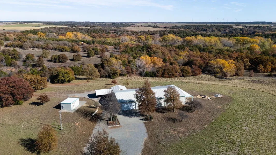 A Unique Escape: 80-Acre Property with Endless Possibilities! Just 1 hour from OKC, discover a one-of-a-kind property that blends rustic charm with modern convenience. The 2200sq ft steel-framed building, set on 80 fully fenced acres, offers a serene retreat perfect for nature lovers, hunters, outdoor enthusiasts, or anyone seeking a private getaway. Features That Inspire: Comfortable Living Space w/a large, open-concept living & dining, providing ample space to entertain friends & family. The Expansive Kitchen is perfect for preparing meals for large gatherings and the Walls of Windows, Wood Floors and Wood Burning Fireplace round out a few of the Amenities. Scenic Views & Outdoor Living: Relax on the 10x46 south-facing covered porch or enjoy the sunrise on the 6x20 east-facing porch. The expansive patio invites you to soak in the sounds of nature or gather around a crackling fire pit under the stars. Versatile Garage & Workshop: A 1000 sq. ft. insulated garage features two 8x16 overhead doors, one w/a Lift Master Opener. Its ideal for use as a workshop, storage for ATVs, or a hobbyists haven. Outdoor Adventure Awaits: Explore over 2 miles of scenic walking/ATV trails lined with cottonwoods, oaks, and black walnuts. Wildlife aboundswhite-tailed deer, turkeys, hogs, quail, and moremaking this property a hunters paradise. The west 40 acres are outfitted with hunting stations, including 3 ground blinds, an elevated blind, and 3 tree stands. Additional Features: White Tail Bunkhouse, A cozy 192sq. ft. space with set of bunk beds, full bath & wall-mounted heat/air unit for year-round comfort. Diverse Terrain: From lush pastures to shaded trails to wooded areas, ravines and canyons, the land offers endless opportunities for recreation and relaxation. Whether you envision this property as a hunting lodge, a second home, or a peaceful getaway, it delivers unmatched versatility & tranquility. Don't miss this Unique Opportunity to own this Extraordinary Retreat.