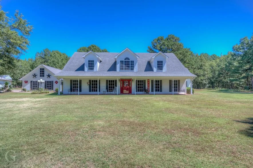 NO CITY TAXES. Your HEARTS DESIRE awaits!! This home with over 150 acres with lots of timber and a huge stocked pond is a must see. Home sits way off road and has security gate. The foyer and living room has beautiful wood flooring. 22 ft ceiling in living room along with wood burning heatilator and2 sets of french doors leading to the amazing patio. The kitchen boasts heated tile floors, lots of cabinets, plenty of counter space, several drawers with pullout shelves and more. This home has a large breakfast room and separate formal dining room. The huge primary suite is downstairs and has tray ceiling, a large sitting room, bath featuring heated tile flooring, separate vanities, jetted tub, 2 large walk-in closets and more. Upstairs has 2 large bedrooms with sitting areas. One has a private full bath. There is also a big media room with surround sound, theater style seating and extra insulations for sound proofing. Between the bedrooms is a large game area. Outside is a 3 car garage with tons of storage and covered walkway to the home. There is also a huge workshop with full bath and kitchen, 2 carport spaces and more. Hunt and fish on your own property. At the back of the cleared acreage is a big blueberry patch. This home and acreage has so much to offer. You could sell timber to help pay for the home. Plenty of room to turn this into a working ranch if wanted. There is not enough room here to describe all this home has to offer. Not many homes like this become available. See the list of amenities that are attached.