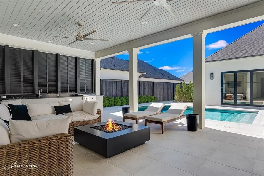 A rare opportunity to own a single-owner, custom-built home thoughtfully designed for refined luxury living. A wooden courtyard entry door welcomes you with a sense of privacy and arrival reminiscent of an exclusive destination, while the quiet street setting, clean lines, crisp details and timeless finishes establish a polished, sophisticated first impression. The single-level home features engineered white oak wood and tile throughout, with no carpet. Exceptional floorplan. A spacious living room features floor-to-ceiling windows and fireplace, offering beautiful views of the outdoor living area & pool while filling the interior with abundant natural light. The space flows seamlessly into the Kitchen and Living. The Chef’s Kitchen anchors the home with GE Monogram appliances, a custom waterfall-edge quartzite island, black granite countertops, a marble backsplash with brass inlay, pot filler, floating shelves and custom vent hood. A sculptural gold and nickel chandelier highlights the island, while a built-in dry bar with wine fridge enhances entertaining. The Dining flanks the Kitchen, offering effortless connection for gatherings large and small. Spacious utility with storage. Drop station off the oversized garage. Wallpapered Powder Room. The private Master Suite is a serene retreat with pool views and a spa-inspired bath featuring a luxurious soaker tub, extensive built-in storage, mirrored-front cabinetry, and a spacious custom closet with chic carpet. Each additional bedroom includes a private en-suite bath, including a casita-style third suite off the courtyard—ideal for guests or extended stays. Outdoor living shines with a fully equipped kitchen featuring Blaze appliances, beverage fridge, gas grill, outdoor TV & a custom gas fire pit reminiscent of those found in destination properties. Enjoy the Provenance lifestyle with walkable or golf-cart access to Rhino Coffee, dining, events & amenities including a neighborhood pool, parks, clubhouse & gym.