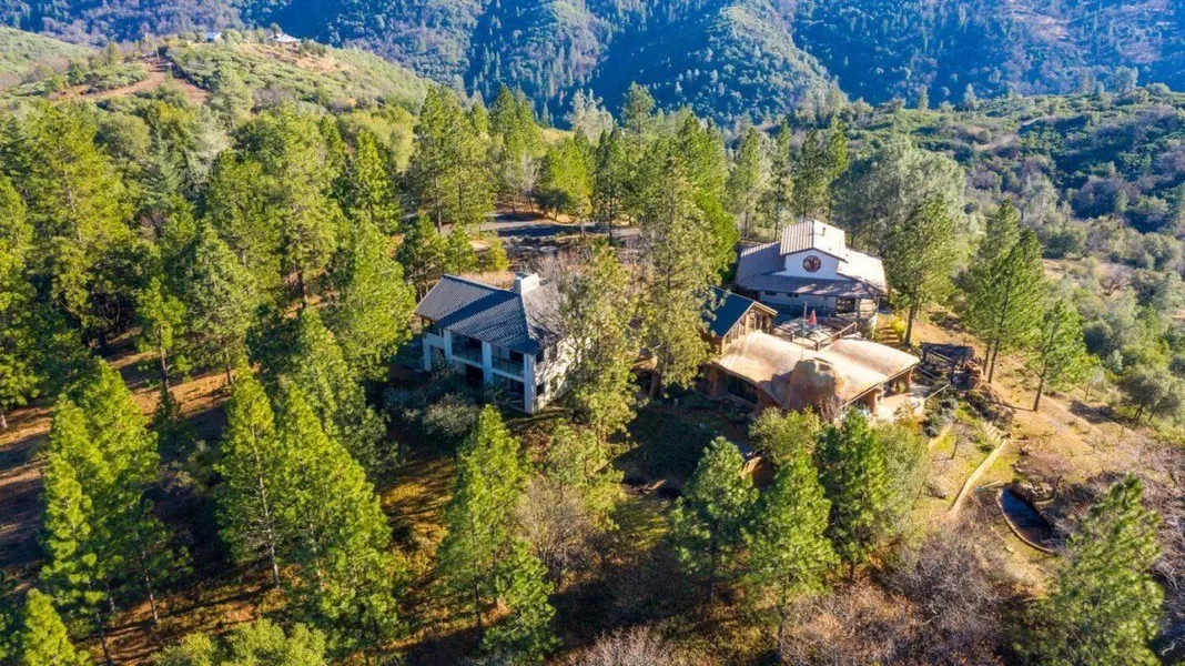 The Querencia is a true California Gem. Sitting on 40 amazing acres, situated in Calaveras County, just 4 miles from the vibrant town of Murphys--a hamlet rich in gold rush history. Views, views, views...this estate is locally known as the "Cave House,'' because of its award-winning, custom distinct architecture. Winner of the AIA design award, Querencia was featured on HGTV's Dream Builders. Top shelf improvements include an 8646 +/- SF main building which is meant to be part of the landscape. It features a huge great room, media room, 4 large suites, and a Caretakers House, all interconnected. There is also a separate Library/Guest House and Small Cabin retreat. The Cave House property has a total of 7 bedrooms, 9 bathrooms, a hidden wine cellar, several kitchens including a fully equipped commercial kitchen, outdoor kitchen with pizza oven... The list goes on. making this a great spot for corporate retreats, VRBO, Airbnb, or a family compound. Other features include a 2000 sqft shop and plenty of room for RV hook-ups.