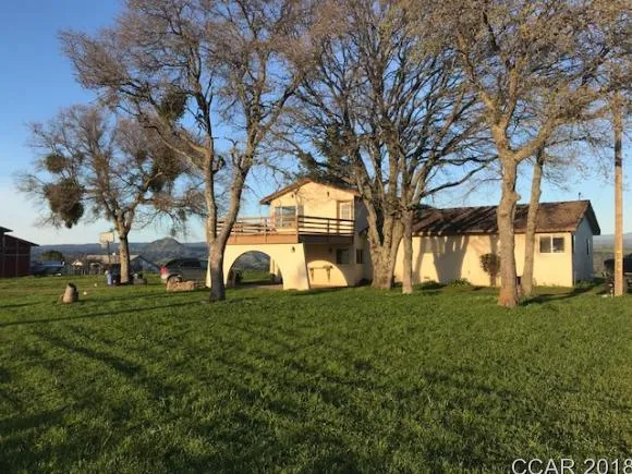 Beautiful view on this 5 acre spanish style home. Freshly painted and new floors and kitchen cabinets and counters and sink in kitchen. New carpet. 3 bedrooms and 3 bathrooms and 1 big room upstairs for mother inlaw quarters or game room etc. Has kitchen sink and area for stove hookup etc. Nice barn with concrete for a couple cars and animal pens. A carport that is enclosed but easy to switch back for more parking. Spectacular views with its own small orchard with fruit trees on this AG land. Fenced in and gates to enter with a circular driveway.