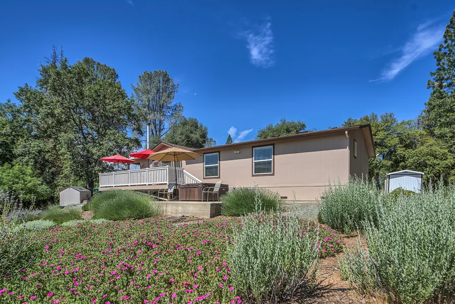 NICE PRICE REDUCTION! Pride of Ownership, on this 4.25 acre parcel with a private setting, on a ridge top bounded by a tree farm and BLM land. Lovely designed 2010 1,431 sq. ft. manufactured home. Covered porch and deck with trex-type decking and a full view of Blue Mountain. This home is designed with vaulted ceilings, rounded corners, recessed and designer lighting. Open Floor Plan and 3rd Bedroom opens up off of the Great Room as a Den/Office. Alder Wood cabinets and all stainless steel appliances in the kitchen.The professional designed landscaped yards have drought resistant plants on a drip system. For your pleasure, there is a large fenced orchard with 20 fruit and nut trees, four types of table grapes and raised garden beds. The Mokelumne River is within walking distance........