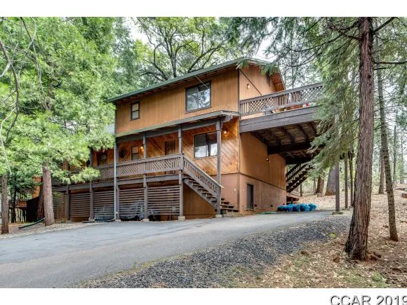 This grand 3 bedroom 2 bathroom Chalet is ready for your enjoyment. Custom features include an open great room with soaring vaulted ceilings, an open kitchen and dining area. The open loft would be a great play or could be used as an extra sleeping area. There is a second deck off the upper bedroom too. Stay warm in the winter with central heat and a wood burning stove. Enjoy the privacy and the great views off the back deck because this property backs up to large acreage with access to forest trails. No HOA dues. A new roof was installed in 2018. Quiet area and privacy as well as extra parking available for family or friends. There is ample storage underneath for your bikes, kayaks and more. And it comes furnished too! This one is a winner!